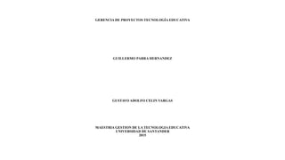 La gestión de proyectos tecnológicos educativos se divide en fases inicial, planificación y ejecución. En la fase inicial se define el alcance del proyecto y se designa al director. En la planificación, el director y el equipo definen los objetivos, tareas, recursos y cronograma. Finalmente, en la ejecución, el director supervisa el avance y verifica hitos hasta entregar el producto final. El director, cliente, patrocinador y equipo de trabajo cumplen roles clave en la gestión exitosa de cualquier proyecto