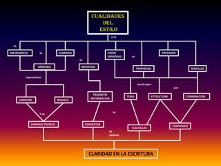 Las cualidades fundamentales de un buen estilo incluyen la claridad, vigor, precisión, expresividad y armonía. Un estilo efectivo transmite información a través de una estructura apropiada que combina variedad, riqueza y dominio técnico de conceptos y contenido. La claridad en la escritura se obtiene a través de la abundancia, brevedad, propiedad y sencillez.