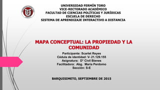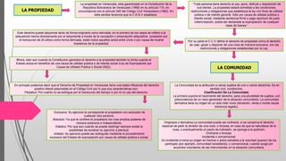 Este documento resume los principales aspectos de la propiedad y la comunidad en Venezuela según la Constitución y el Código Civil. Explica que la Constitución garantiza el derecho a la propiedad pero también lo limita cuando el Estado actúa por utilidad pública o interés social. Define la propiedad como el derecho exclusivo, absoluto y elástico de usar, gozar y disponer de una cosa. La comunidad se define como la atribución de derechos a varios sujetos y puede ser originaria o derivada, ordinaria o forzosa, e incidental o conven