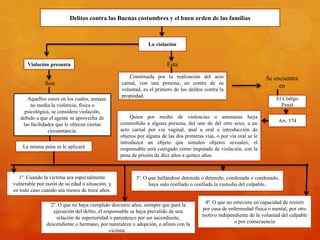 Este documento resume los delitos de violación y contra la libertad individual según el Código Penal venezolano. La violación se define como el acto carnal contra la voluntad de una persona mediante violencia o amenazas, y se castiga con 10 a 15 años de prisión. También se considera violación cuando la víctima es especialmente vulnerable o no puede resistirse. Los delitos contra la libertad incluyen impedir el ejercicio de derechos políticos, ofender la libertad de culto y privar ilegítimamente de la libertad a otra persona.