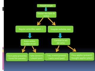 Este documento presenta un mapa conceptual sobre el pasado simple y los adjetivos. Explica que existen verbos regulares e irregulares en el pasado simple y cómo cambian sus formas. También define los adjetivos predicativos y atributivos, e introduce las formas comparativa y superlativa de los adjetivos.