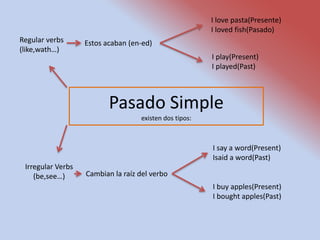 Este documento describe los diferentes tipos de verbos en el pasado simple y los diferentes tipos de adjetivos en inglés. Explica que los verbos regulares terminan en "-ed" en el pasado, mientras que los verbos irregulares cambian su raíz. Luego enumera varias categorías de adjetivos como propios, interrogativos, posesivos, numerales, de cantidad, distributivos, demostrativos y calificativos con ejemplos de cada uno.