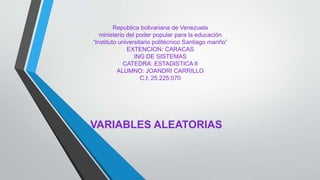 Este documento es un registro académico que detalla que el estudiante Joandri Carrillo, con cédula de identidad 25.225.070, está cursando la asignatura de Estadística II en la carrera de Ingeniería de Sistemas en el Instituto Universitario Politécnico Santiago Mariño en Caracas, Venezuela.
