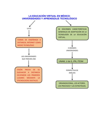 Este documento describe la educación virtual en México y las principales universidades que la adoptaron. Explica que la UNAM, UdeG, IPN y Tec de Monterrey fueron pioneras en educación a distancia mediante tecnología. Mientras la UNAM, UdeG e IPN lo complementaron a su misión institucional, el Tec lo incorporó como parte de su estrategia para brindar educación a poblaciones con necesidades específicas. En los últimos años, más universidades se han orientado al uso de las tecnologías de la información para educación virtual