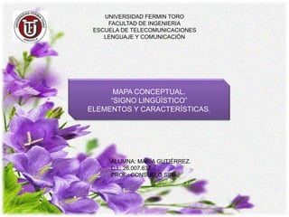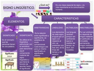 El documento describe el signo lingüístico, la clase más importante de signo en la comunicación humana. Explica que un signo lingüístico tiene dos elementos: el significado, que es el concepto que las personas tienen de una palabra, y el significante, que es la forma material de la palabra. Además, describe cuatro características de los signos lingüísticos: la arbitrariedad, la linealidad, la mutabilidad y la inmutabilidad.