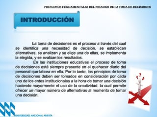 El documento aborda los principios fundamentales del proceso de toma de decisiones en instituciones educativas, destacando su importancia diaria y la necesidad de creatividad para generar alternativas. La toma de decisiones implica identificar necesidades, establecer alternativas, evaluar y ejecutar decisiones, basándose en criterios de eficacia, eficiencia y efectividad. Se enfatiza que la toma de decisiones es esencial para el logro de objetivos y la planificación eficiente dentro de la administración educativa.