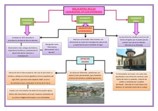 Este documento presenta un mapa conceptual que resume las relaciones entre diferentes áreas de la geografía en Ecuador. Incluye información sobre el Observatorio Astronómico de Quito, fundado en 1873 y declarado Patrimonio Monumental de la Nación, la Mitad del Mundo, el Museo de Arte Precolombino ubicado en el centro histórico de Quito, y el Instituto Geográfico Militar de Ecuador ubicado al norte de Quito.