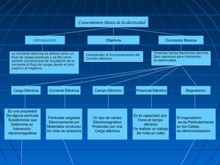 El documento presenta un mapa conceptual sobre conceptos básicos de electricidad. Explica que la corriente eléctrica se define como el flujo de cargas positivas desde el polo positivo al negativo de un circuito. Luego describe elementos técnicos como carga eléctrica, corriente, campo eléctrico y potencial eléctrico. También diferencia entre conductores de primer, segundo y tercer orden, y define un circuito eléctrico como una serie de componentes como resistencias y condensadores. Por último, presenta tipos de materiales magnéticos
