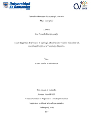 El documento presenta un mapa conceptual sobre la gerencia de proyectos de tecnología educativa, elaborado por José Fernando Garrido Aragón como requisito para la maestría en gestión de la tecnología educativa. Este mapa resume los elementos clave del ciclo de vida de los proyectos, incluyendo herramientas, roles y fases, para garantizar el éxito en la formulación de estos. Además, incluye definiciones sobre conceptos relacionados con la gerencia y referencias bibliográficas pertinentes.