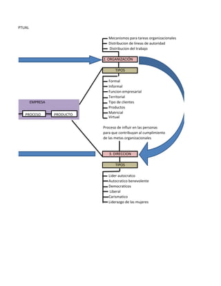 Este documento presenta un mapa conceptual de los elementos clave de la planificación, organización, dirección y control de una empresa. La planificación incluye la definición de objetivos, estrategias, políticas, procedimientos y presupuestos. La organización se refiere a la distribución de líneas de autoridad y trabajo. La dirección implica influir en las personas para lograr las metas. El control mide y corrige el desempeño a través de mecanismos preliminares, concurrentes y de retroalimentación.