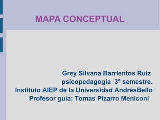 La psicopedagogía es el estudio de los procesos de enseñanza y aprendizaje en relación con el desarrollo psicológico. Este mapa conceptual sobre psicopedagogía fue creado por Grey Silvana Barrientos Ruiz para su tercer semestre en el Instituto AIEP de la Universidad Andrés Bello bajo la guía del profesor Tomas Pizarro Meniconi.