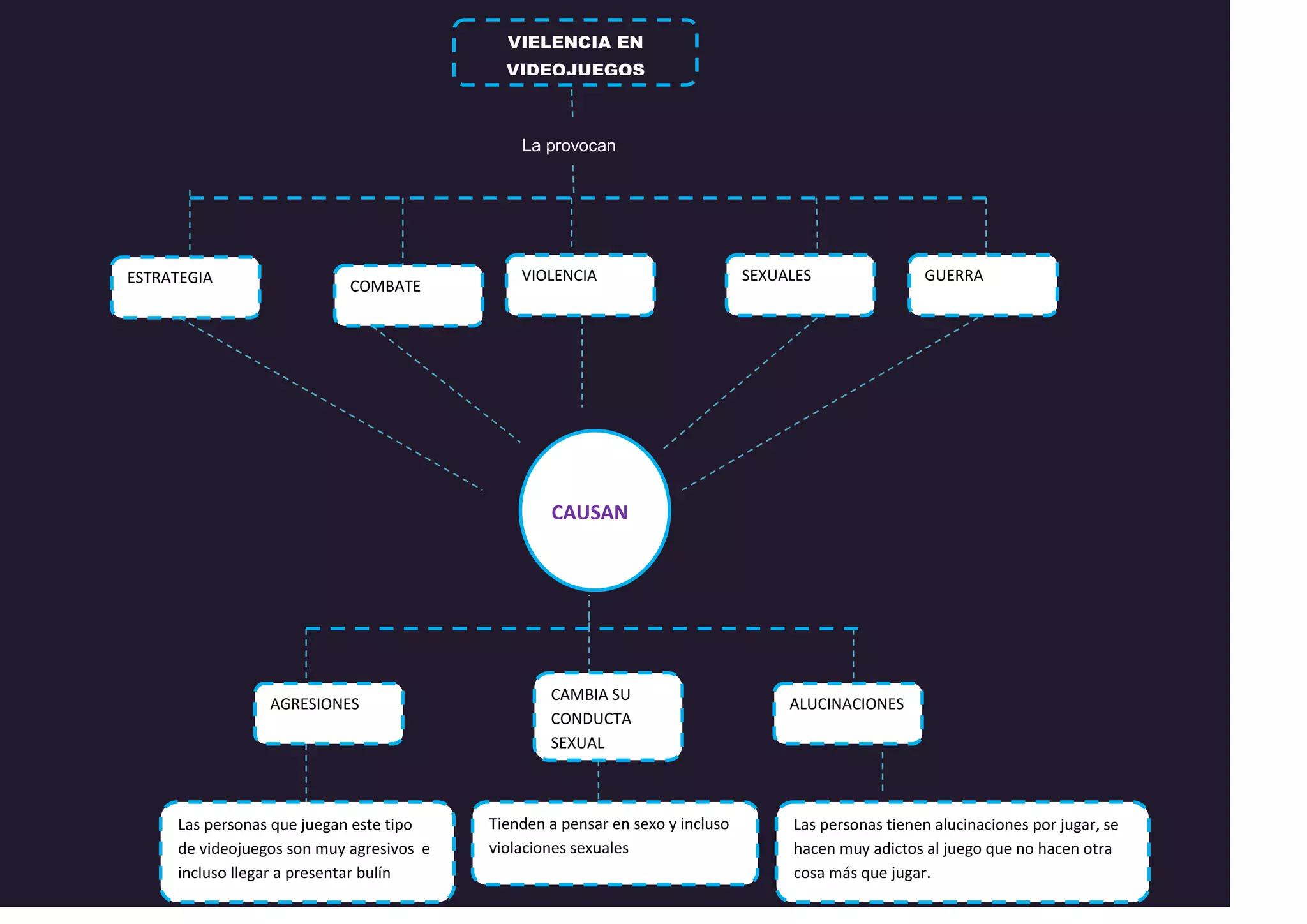 CAUSANLas personas tienenalucinaciones por jugar, se hacen muy adictos al juego que no hacen otra cosa más que jugar.Tienden a pensar en sexo y incluso violaciones sexualesLas personas que juegan este tipo de videojuegos son muy agresivos e incluso llegar a presentar bulínALUCINACIONESCAMBIA SU CONDUCTA SEXUALAGRESIONESCOMBATEESTRATEGIAGUERRASEXUALESVIOLENCIALa provocanVIELENCIA EN VIDEOJUEGOS<br />