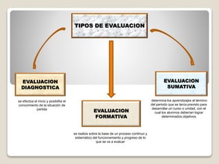 El documento describe tres tipos de evaluación: evaluación diagnóstica, la cual se efectúa al inicio para conocer la situación de partida; evaluación formativa, que es un proceso continuo para monitorear el progreso; y evaluación sumativa, que determina los aprendizajes al término del periodo para verificar si se lograron los objetivos.