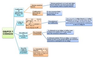 El documento explora la codificación y detección de errores en sistemas binarios, centrándose en el sistema numérico binario y la función codificadora (m, n). Se detallan procedimientos para la codificación y decodificación utilizando el método de Hamming, así como la verificación de paridad. Se menciona la importancia de la distancia mínima en un código para la corrección de errores en la transmisión de datos.