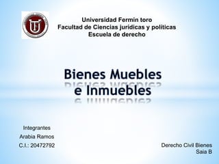 Este documento describe los bienes inmuebles y muebles según el Código Civil de Venezuela. Explica que los bienes inmuebles incluyen terrenos, minas, edificios y otras construcciones adheridas permanentemente a la tierra, así como derechos como la propiedad, el usufructo y las servidumbres sobre bienes inmuebles. Los bienes muebles son aquellos que pueden moverse por sí mismos o con fuerza, como vehículos y muebles, además de derechos y acciones relacionados con bienes m