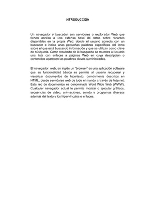 Este documento presenta un mapa conceptual de los navegadores web más utilizados. Explica que un navegador permite a los usuarios ver páginas web al recuperar documentos de hipertexto como HTML desde servidores a través de Internet, mientras que un buscador permite a los usuarios buscar información en la web ingresando palabras clave. Luego presenta un mapa conceptual de los principales navegadores y concluye que los buscadores son herramientas útiles que permiten buscar información de manera automática, analítica, sistemática