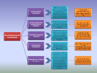 Este documento describe diferentes métodos para factorizar polinomios, incluyendo factor común, agrupación de términos, trinomio cuadrado perfecto, diferencia de cuadrados, y factorizando un trinomio de la forma x2 + bx + c.
