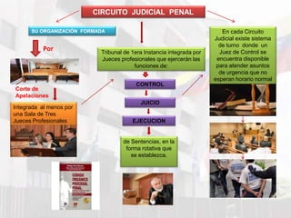 El documento describe la organización y funciones del Circuito Judicial Penal en Venezuela. El Circuito Judicial Penal está compuesto por una Corte de Apelaciones integrada por al menos tres jueces profesionales y varios Tribunales de Primera Instancia. Los Tribunales de Primera Instancia se encargan de las fases de investigación, juicio y ejecución de sentencias. El Circuito Judicial Penal también incluye servicios administrativos dirigidos por un Juez Presidente.