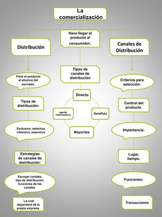 La comercialización hace llegar el producto al consumidor a través de canales de distribución que pueden ser directos, detallistas, mayoristas o intermediarios. La selección de los canales de distribución depende de factores como el control sobre el producto, la importancia del lugar y el tiempo, y las funciones de transacciones y puesta a disposición del mercado. Las estrategias de canales de distribución implican elegir los canales apropiados, el tipo de distribución y las funciones de cada canal, lo que dependerá de cada empresa.