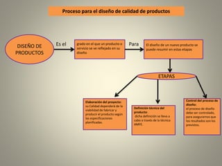 Este documento describe el proceso de diseño de productos y calidad de productos. Explica que el diseño de productos implica etapas como la elaboración de un proyecto, la definición técnica del producto y el control del proceso de diseño. Además, define la calidad de un producto como la percepción del cliente en función de las características evaluadas y su nivel de importancia para el cliente. Finalmente, señala que la calidad se basa en indicadores como la conformidad con las especificaciones y el funcionamiento al utilizar el producto.