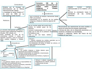 El documento presenta el Convenio 169 de la Organización Internacional del Trabajo sobre Pueblos Indígenas y Tribales Independientes. Este convenio revisa el Convenio de 1957 adoptando nuevas normas para eliminar la orientación hacia la asimilación y reconociendo las aspiraciones de los pueblos indígenas a controlar sus propias instituciones. Incluye artículos que establecen que los pueblos indígenas deberán gozar de derechos humanos sin discriminación, que los gobiernos son responsables de proteger sus derech