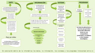 El documento presenta un mapa conceptual sobre los conceptos de dato, información, sistema y programa. Explica que los datos se convierten en información a través del procesamiento y que esta permite transmitir conocimiento. Define a los sistemas como conjuntos de elementos interdependientes e interactuantes y a los programas como conjuntos de instrucciones que ejecutan las computadoras. Concluye que estos conceptos interactúan entre sí para administrar hardware, organizar datos y evolucionar dentro de la informática.