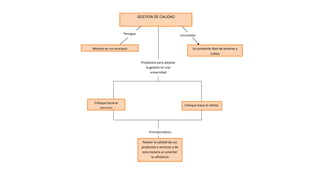 La gestión de calidad en una universidad busca mejorar procesos, consolidar un ambiente sin temores ni culpas, adoptar propósitos centrados en el personal y los clientes, y realzar la calidad de productos y servicios para aumentar la eficiencia.