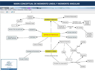El documento presenta un mapa conceptual sobre el momento lineal y momento angular para un curso de Física I. El mapa conceptual incluye definiciones, fórmulas y ejemplos de momento lineal y momento angular para ayudar a los estudiantes a comprender estos conceptos fundamentales de la física.