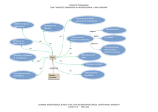 Este documento compara un proyecto tecnológico y la metodología de investigación. Un proyecto tecnológico tiene etapas de identificación de oportunidades, diseño, organización, planificación, ejecución, evaluación y perfeccionamiento. La metodología de investigación incluye concebir una idea, plantear un problema, elaborar un marco teórico, establecer una hipótesis, definir el tipo de investigación, determinar la población y muestra, recolectar datos, analizarlos y presentar resultados