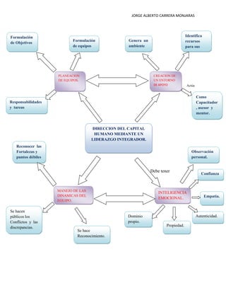 Este documento describe las responsabilidades de un líder de equipo para formular objetivos, crear un entorno de apoyo, planear equipos, actuar como capacitador y asesor, manejar conflictos de manera abierta, desarrollar inteligencia emocional, ejercer liderazgo integrador que reconozca las fortalezas y debilidades de los miembros del equipo.
