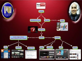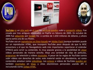 YouTube es un sitio web creado en 2005 que permite a los usuarios subir y compartir videos. Fue adquirido por Google en 2006 y opera como una de sus filiales. Los usuarios pueden ver videos de películas, programas de televisión, música y videoblogs subidos por otros a través de un reproductor en línea basado en Adobe Flash.