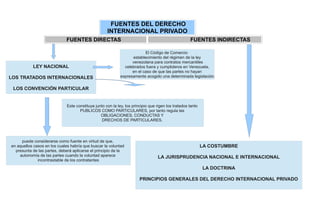 Este documento resume las principales fuentes del derecho internacional privado, incluyendo fuentes directas como leyes nacionales, tratados internacionales y convenciones particulares, e indirectas como la costumbre, jurisprudencia y doctrina. Explica brevemente cada fuente, como que la ley nacional establece el régimen legal para contratos celebrados fuera del país, los tratados rigen obligaciones públicas y privadas, la costumbre ha sido la base histórica de este derecho, la jurisprudencia ayuda a resolver casos sin normas claras, y la
