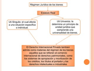 El documento analiza el régimen jurídico de los bienes según el derecho internacional privado, destacando la lex rei sitae como la ley aplicable en función de la ubicación de los bienes. Se aborda el desplazamiento de bienes muebles y su posible conflicto con distintas legislaciones, así como la aplicación de normas específicas frente a situaciones internacionales. También se menciona la regulación de derechos patrimoniales en el comercio internacional y las implicaciones legales de los cambios de ubicación de estos bienes.