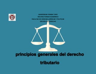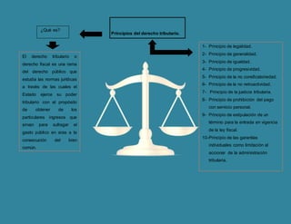 El documento describe los principios fundamentales del derecho tributario. Explica que el derecho tributario es la rama del derecho público que estudia las normas a través de las cuales el Estado obtiene ingresos de los ciudadanos para financiar el gasto público. Luego enumera y brinda detalles sobre 10 principios clave del derecho tributario, incluidos la legalidad, generalidad, igualdad, progresividad, no confiscatoriedad, no retroactividad, justicia tributaria, prohibición del pago en servicio personal, estipulación de plazos, y garant