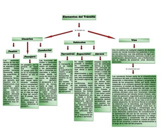 El documento describe los diferentes elementos del tránsito, incluyendo usuarios (peatones, pasajeros, conductores), vehículos terrestres, aéreos y especiales, y vías. Los peatones son el modo de transporte más versátil ya que solo requieren una superficie para caminar, mientras que otros modos requieren más infraestructura. Un pasajero es alguien que compra un boleto para viajar en transporte público. Las funciones de un conductor incluyen trasladar pasajeros de un punto a otro de manera segura y eficiente. Ex