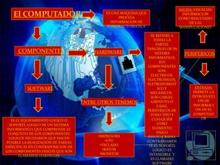 Este documento describe los componentes básicos de un computador. Explica que un computador es una máquina que procesa información de forma automática. Luego define el software como el conjunto de componentes lógicos necesarios para realizar tareas específicas, en contraposición al hardware que son las partes físicas tangibles como cables, gabinetes y periféricos. Finalmente menciona algunos periféricos comunes como teclado, ratón, monitor e impresora que permiten la entrada y salida de información al computador.