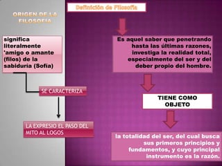 Este documento presenta una introducción a la filosofía, describiendo que es la búsqueda de la sabiduría a través de la razón. Se divide en diferentes ramas como la metafísica, la lógica, la ética y la filosofía del derecho. Explica los diferentes tipos de conocimiento como el mitológico, ordinario y científico. También describe varios métodos filosóficos como la mayéutica, el deductivo, el inductivo y el fenomenológico.