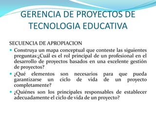 El documento describe la gerencia de proyectos educativos y el rol del profesional en este campo. Explica que un gerente de proyectos planifica, organiza, ejecuta, controla los recursos, y lidera el equipo para cumplir los objetivos. Además, detalla que el ciclo de vida de un proyecto consiste en fases iniciales, intermedias y finales, y que es responsabilidad del director del proyecto, el equipo, el cliente, el patrocinador y otros establecer y garantizar estas fases.