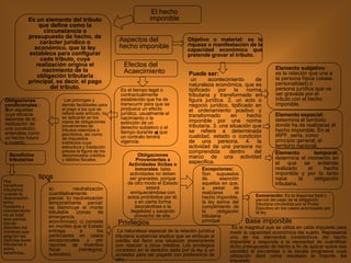 El documento define el hecho imponible como la circunstancia o presupuesto de hecho, de carácter jurídico o económico, que la ley establece para configurar cada tributo y cuya realización origina la obligación de pagar el tributo. Explica que el hecho imponible tiene cuatro elementos: objetivo o material, subjetivo, espacial y temporal. También describe los efectos del acaecimiento del hecho imponible como las obligaciones condicionales, los plazos, las excepciones como las exoneraciones y los beneficios