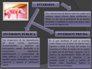 El documento habla sobre diferentes tipos de inversión como inversión pública, inversión privada e inversiones en general. También describe el sistema financiero y su función de canalizar el ahorro de unidades con superávit hacia unidades con déficit. Finalmente, explica que el Sistema Nacional de Inversión Pública (SNIP) es un instrumento del Estado que aplica principios y procedimientos para formular, evaluar y ejecutar proyectos de inversión pública y optimizar el uso de recursos públicos para el desarrollo del país.