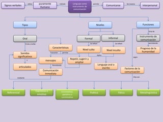 Este documento describe los diferentes niveles y tipos de lenguaje como instrumento de comunicación. Explica que el lenguaje oral es puramente humano y permite la comunicación interpersonal mediante sonidos articulados. Además, señala que el lenguaje puede ser formal o informal y que sirve como instrumento fundamental para el progreso de la humanidad al permitir transmitir, repetir, sugerir y ampliar mensajes. Por último, menciona diversos factores de la comunicación como la metalingüística, fática, poética, connotativa, apelativa,