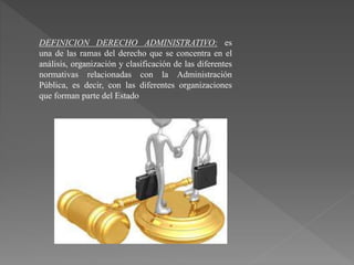 El documento define el derecho administrativo como la rama del derecho que analiza, organiza y clasifica las normativas relacionadas con la administración pública. Luego enumera las fuentes del derecho administrativo, incluyendo la constitución, las leyes, los tratados, decretos leyes, reglamentos, principios, costumbres, jurisprudencia, doctrina. Finalmente, indica que las fuentes son los medios por los cuales se elaboran las reglas del derecho positivo.