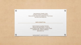 El documento presenta un mapa conceptual sobre lógica jurídica. Explica que la lógica estudia los métodos y principios para identificar el razonamiento correcto e incorrecto. Divide la lógica en analítica, que expone los criterios de verdad, y dialéctica, que estudia cómo saber si algo cumple dichos criterios. También describe las relaciones entre la lógica y otras ciencias como la semántica, epistemología y ontología. El objetivo final es proveer nociones fundamentales de lógica para aplicarla y mejor