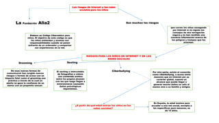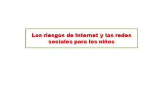 El documento habla sobre los riesgos que enfrentan los niños al usar Internet y redes sociales, como el grooming donde un adulto gana la confianza de un menor con intenciones sexuales, el sexting que es el intercambio de fotos o videos eróticos entre jóvenes que luego pueden usar para chantaje, y el ciberacoso entre pares que por la naturaleza global de Internet puede dañar no solo al menor sino también a su familia y amigos. También menciona que en España la edad mínima para usar redes sociales generales es 14
