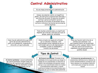 Este documento trata sobre el control como una función administrativa clave en la gestión de una organización. Explica que el control permite verificar si los resultados de una organización concuerdan con sus objetivos y define diferentes tipos de control como el preliminar, concurrente y de retroalimentación. También menciona que el control tiene diversas connotaciones y puede entenderse como una función del proceso administrativo o como un medio de regulación utilizado para acompañar el desempeño de una empresa.