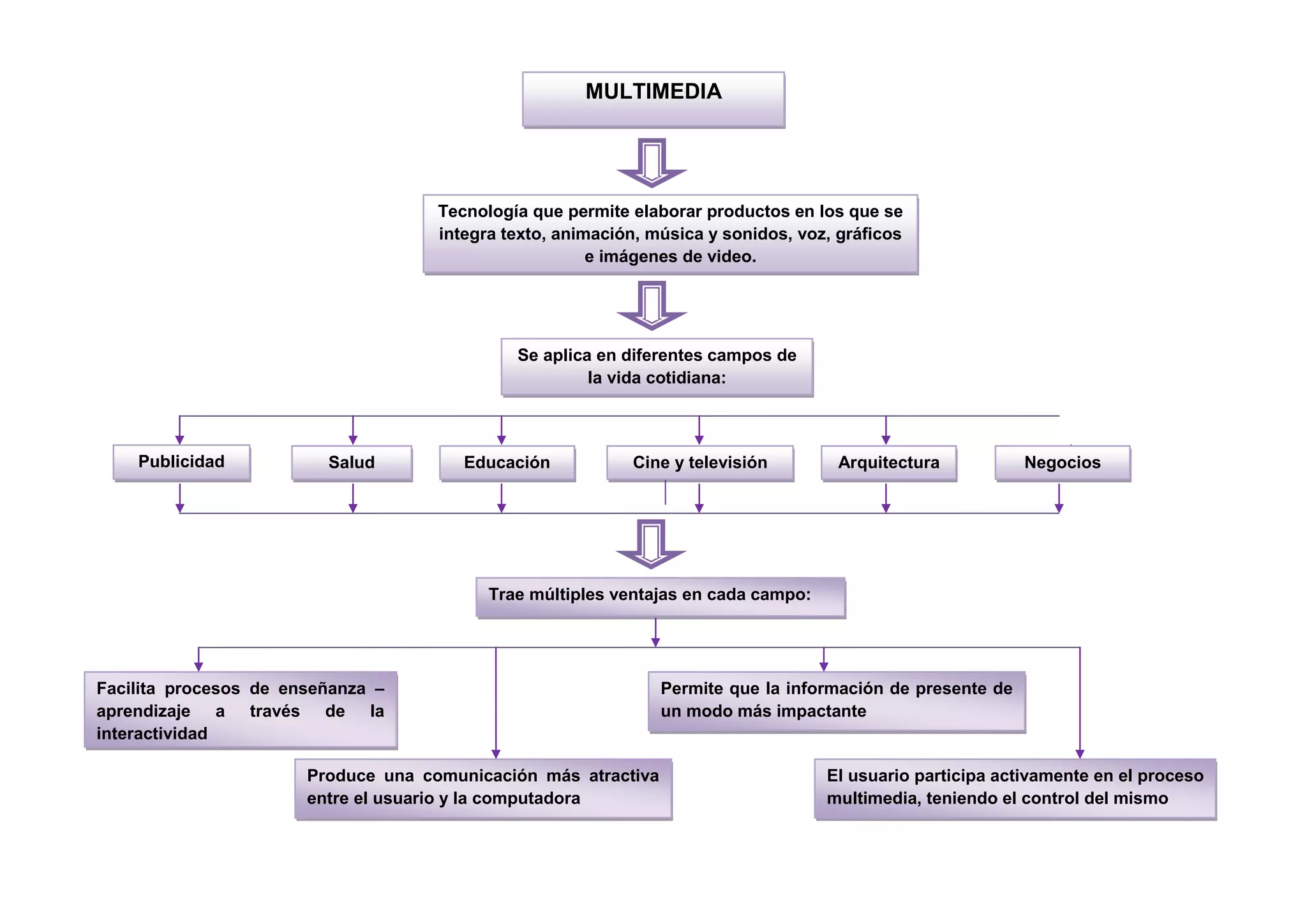 El documento habla sobre la tecnología multimedia, la cual permite integrar texto, imágenes, sonido y video para crear productos interactivos. Esta tecnología se aplica en diversos campos como publicidad, educación, cine, negocios y más, facilitando procesos de enseñanza y permitiendo que la información se presente de manera atractiva e interactiva.