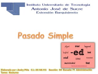 Este documento describe el tiempo verbal pasado en inglés, el cual se utiliza para describir acciones que ocurrieron y finalizaron en el pasado. Explica que el verbo principal siempre está en pasado y que se compone de elementos sencillos como verbos y adjetivos regulares e irregulares, donde los regulares forman el pasado agregando "d" o "ed" y los irregulares cambian su forma de escribir o pronunciación.