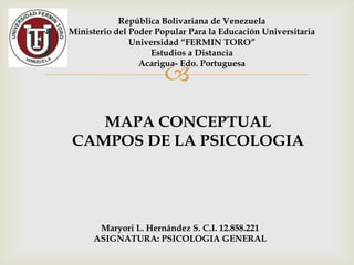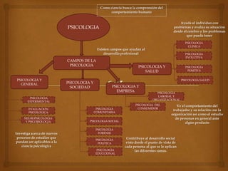 Este documento presenta un mapa conceptual de los campos de la psicología. Brevemente describe que la psicología busca comprender el comportamiento humano y que existen diversos campos como la psicología clínica, evolutiva, positiva y de la salud que ayudan al individuo con problemas. También describe campos como la psicología social, forense, política y educacional que contribuyen al desarrollo social desde la perspectiva de cada persona.
