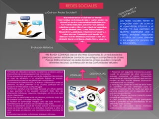 Las redes sociales son estructuras donde los individuos (nodos) están conectados por diferentes tipos de relaciones (aristas). Se originaron en 1995 con el sitio Classmates y evolucionaron en 2000 para permitir que amigos compartan recursos. Tienen ventajas como facilitar relaciones, aprendizaje y trabajo colaborativo, pero también desventajas como falta de privacidad e invasión por personas con segundas intenciones.