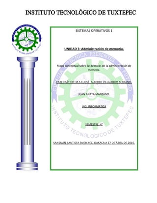 El documento presenta un resumen de las técnicas de administración de memoria como la partición fija, paginación simple, partición dinámica, segmentación simple, memoria virtual segmentada y memoria virtual paginada. Describe las características, ventajas y desventajas de cada técnica. El documento fue escrito por Juan Anaya Manzano para la asignatura de Sistemas Operativos 1 del Instituto Tecnológico de Tuxtepec.